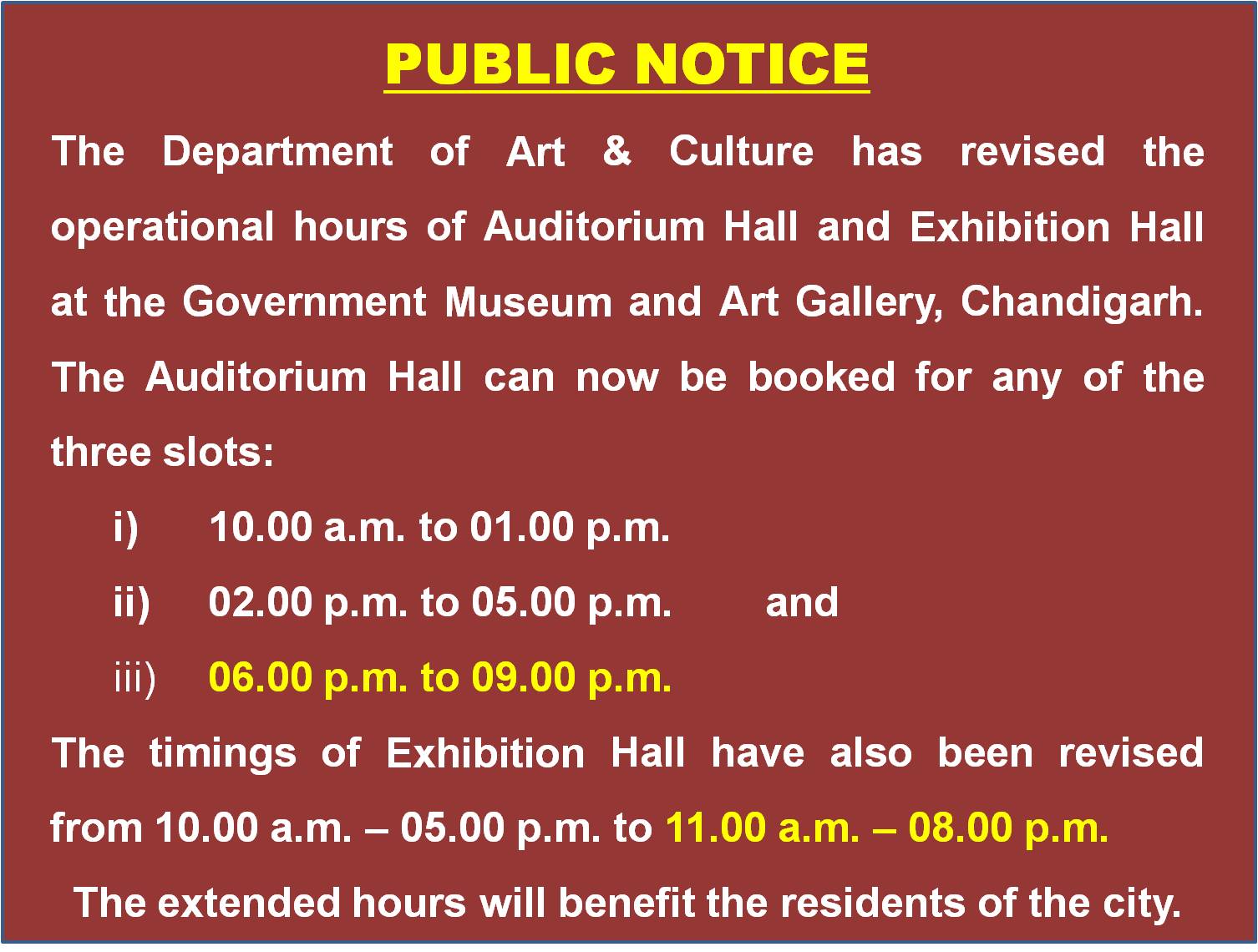 Public Notice for Extended Hours for Auditorium and Exhibition Hall Know More