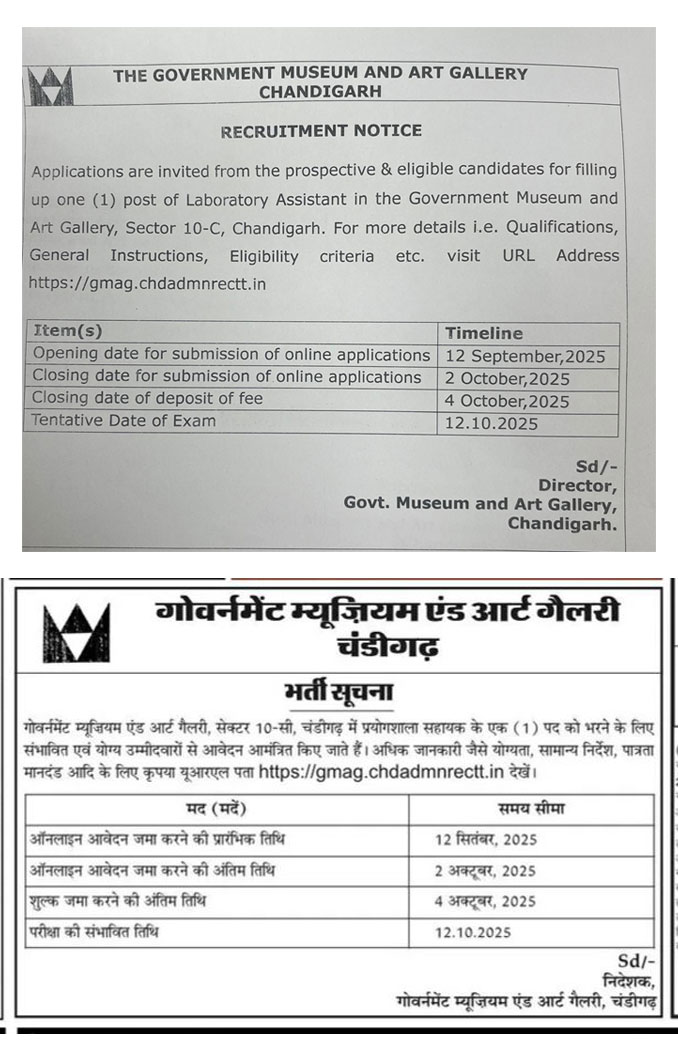 Applications are invited from the prospective & eligible candidates for filling up one (1) post of Laboratory Assistant in the Government Museum and Art Gallery, Sector 10-C, Chandigarh. For more details i.e. Qualifications, General instructions, Eligibility criteria etc. visit official website https://gmag.chdadmnrectt.in/